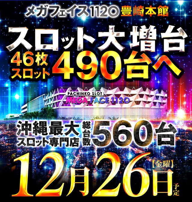 沖縄県豊見城市にて営業中のパチンコホール『メガフェイス1120豊崎本館』は、2025年12月26日(金)にリニューアルオープンを予定している。