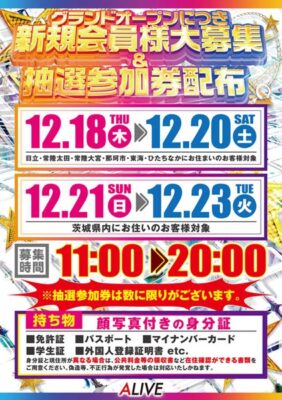 【グランドオープン】茨城県最大級の店舗の誕生、茨城県那珂市にてパチンコ店『ALIVE東海南店』が12月26日新規オープン
