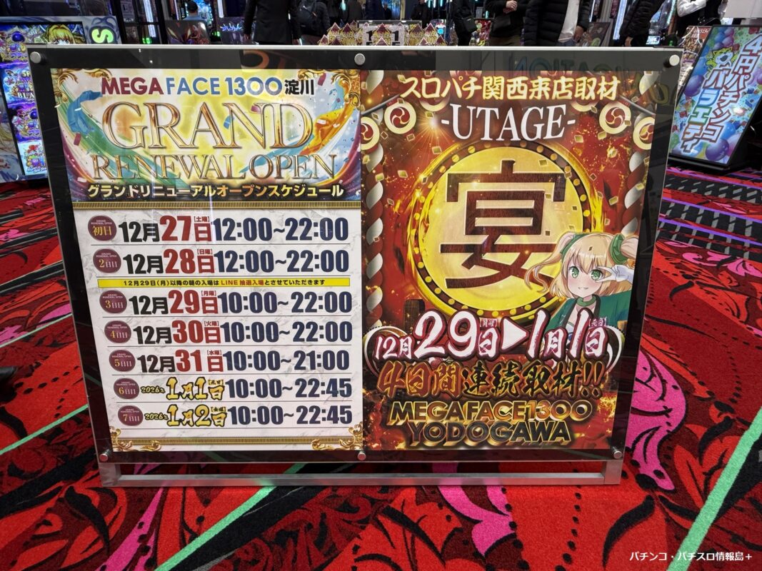 大阪府大阪市淀川区のパチンコホール『MEGAフェイス1300淀川』が、本日2025年12月27日(土)12時にグランドリニューアルオープンを果たした。