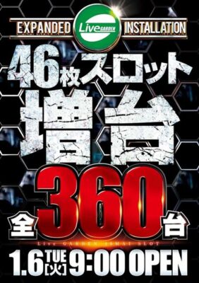 栃木県鹿沼市のパチンコ店『ライブガーデン鹿沼グランドシティ』が、2026年1月6日(火)に1,000円46枚スロットを増台する。346台から360台へ増台するとのことだ。