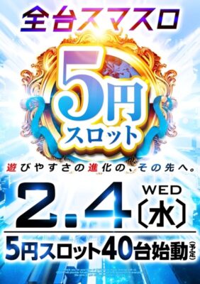 そのような環境下で営業している同店であるが、昨年12月26日(金)にはパチスロ台数を247台から287台へと増台しており、今回さらに5円パチスロを新たに導入することとなった。