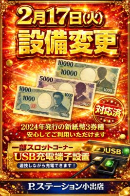 新紙幣対応サンド設置、スロットコーナー一部USB設置