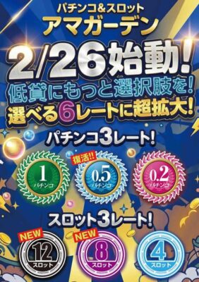 兵庫県尼崎市のパチンコ店『パチンコ アマガーデン』が、2026年2月26日(木)に0.5円パチンコを復活導入する。