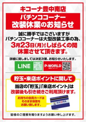 【関連記事】大阪府豊中市のパチンコ店『キコーナ豊中南店』のスロットコーナーが3月16日より休業に入る、大型改装工事のため
