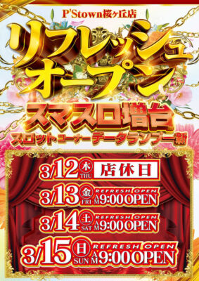 1000円46枚スロット増台(170台→192台)、総台数増台(480台へ)、3/2~3/6店休