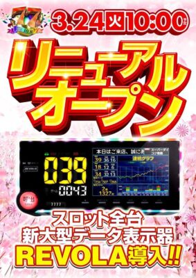 スロット増台、3/23・3/24リニューアル工事のため店休
