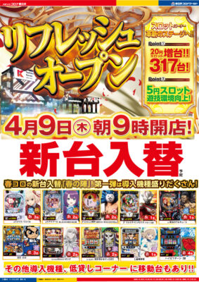 総台数増台(808台へ)、1000円46枚スロット増台(322台へ)、スロットコーナー全台データ表示機一新