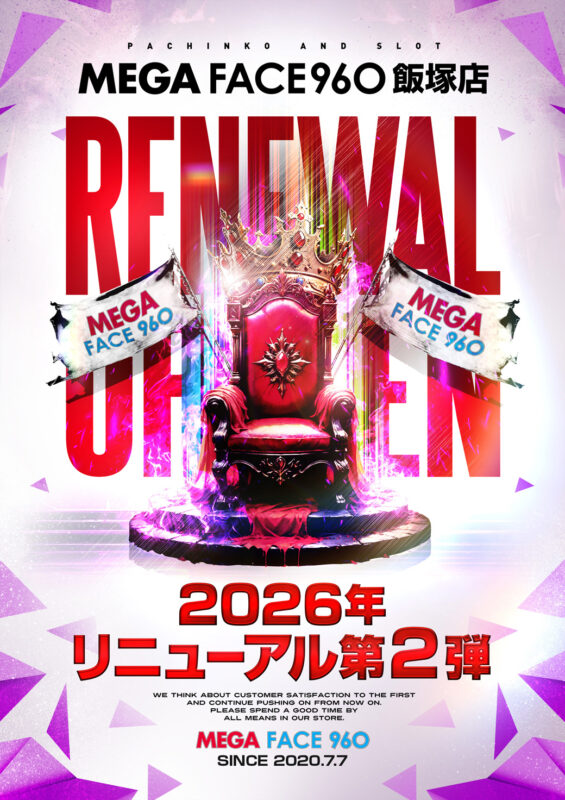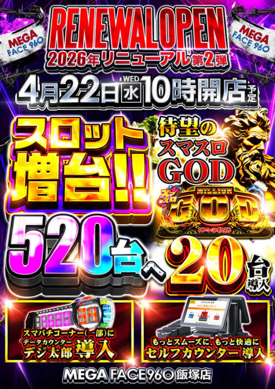 福岡県飯塚市にて営業中のパチンコホール『メガフェイス960飯塚』が、2026年4月22日(水)にリニューアルオープンを実施する。