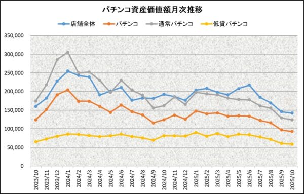 中古機市場において取引が確認され、中心価格が判明している機種の合計設置台数及び当該機種の合計金額から算出したものです。(機種別設置台数×当該週の中古中心価格÷中古価格判明機種台数 )