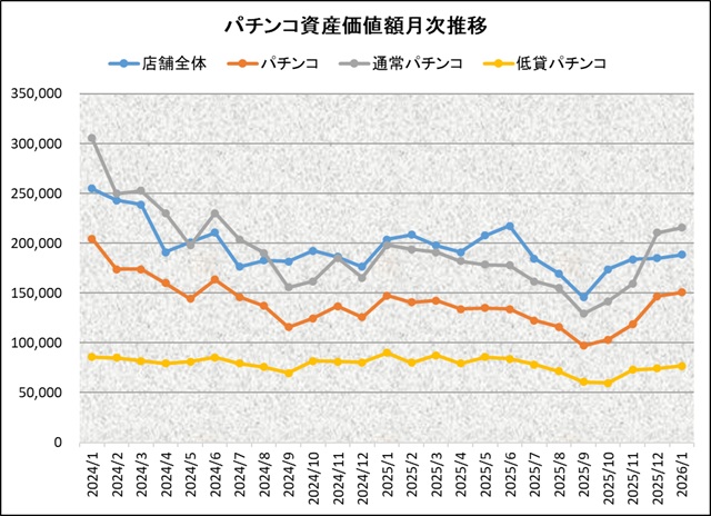 情報島+ HOME > パチンコ資産価値額推移 月次資産価値額推移 ※毎月月末週データにて集計 ※2026年1月に限り第1週データで集計 「遊技機1台当たりの資産価値」とは 中古機市場において取引が確認され、中心価格が判明している機種の合計設置台数及び当該機種の合計金額から算出したものです。(機種別設置台数×当該週の中古中心価格÷中古価格判明機種台数 ) (※2026年1月7日時点) 2025年3月1日 author