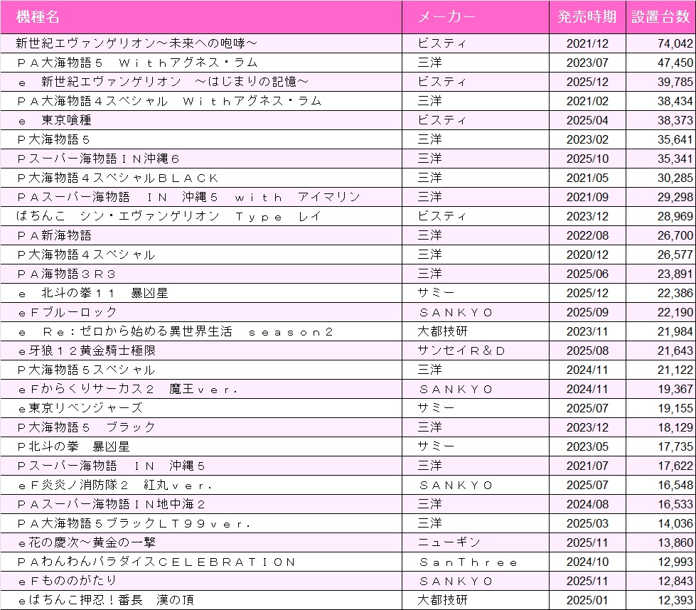 パチンコ機種別設置台数ランキング