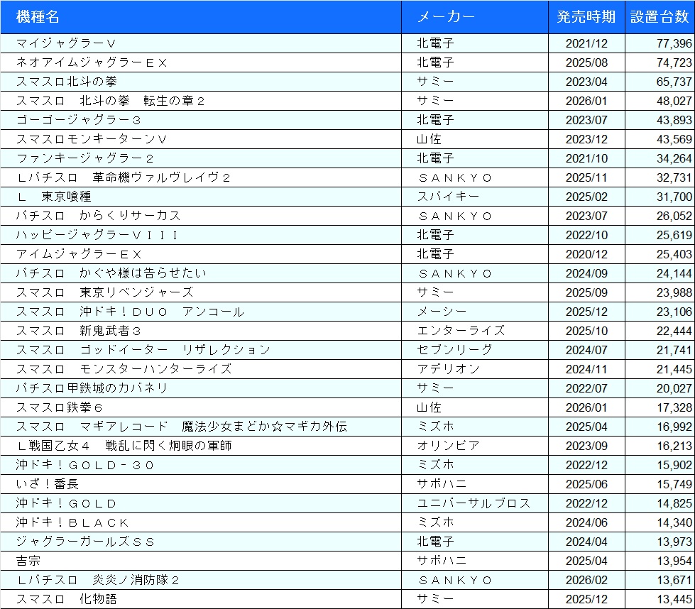 パチスロ機種別設置台数ランキング