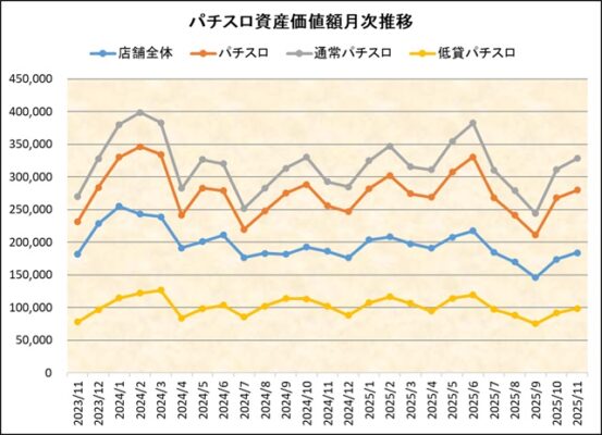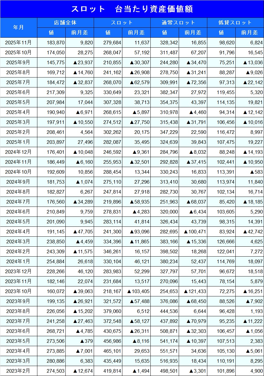 情報島+ HOME > パチスロ資産価値額推移 月次資産価値額推移 ※毎月月末週データにて集計 「遊技機1台当たりの資産価値」とは 中古機市場において取引が確認され、中心価格が判明している機種の合計設置台数及び当該機種の合計金額から算出したものです。(機種別設置台数×当該週の中古中心価格÷中古価格判明機種台数 ) (※2025年11月26日時点) 2025年3月1日 author