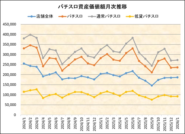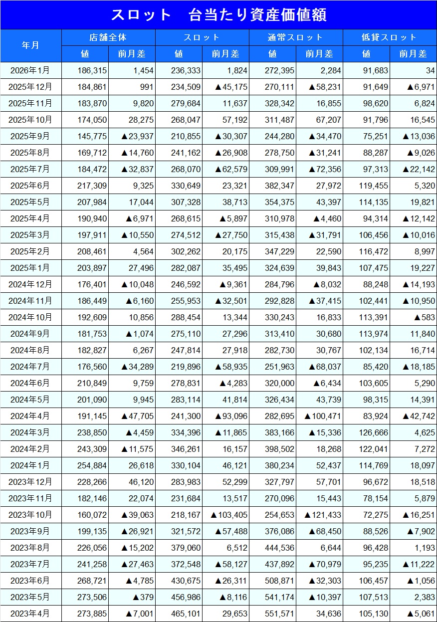 情報島+ HOME > パチスロ資産価値額推移 月次資産価値額推移 ※毎月月末週データにて集計 ※2026年1月に限り第2週データで集計 「遊技機1台当たりの資産価値」とは 中古機市場において取引が確認され、中心価格が判明している機種の合計設置台数及び当該機種の合計金額から算出したものです。(機種別設置台数×当該週の中古中心価格÷中古価格判明機種台数 ) (※2025年1月14日時点) 2025年3月1日 author