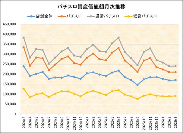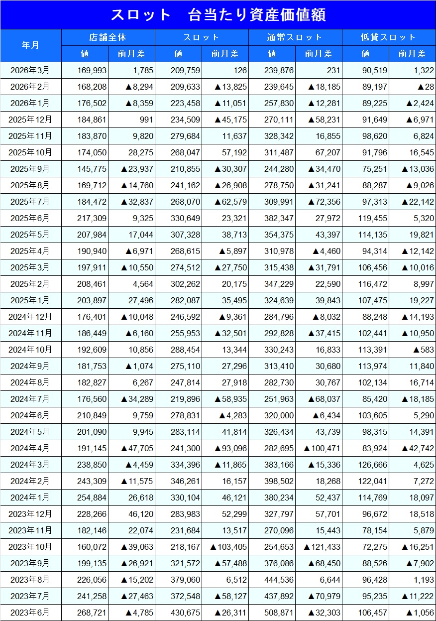 情報島+ HOME > パチスロ資産価値額推移 月次資産価値額推移 ※毎月月末週データにて集計 ※2026年3月に限り第1週データで集計 「遊技機1台当たりの資産価値」とは 中古機市場において取引が確認され、中心価格が判明している機種の合計設置台数及び当該機種の合計金額から算出したものです。(機種別設置台数×当該週の中古中心価格÷中古価格判明機種台数 ) (※2025年3月4日時点) 2025年3月1日 author